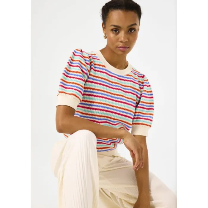 Ajour gebreide trui met streeppatroon. Een fijn en comfortabel item. Deze trui heeft korte pofmouwen, een ronde hals en een regular fit. Dit item is gemaakt van 100% katoen.