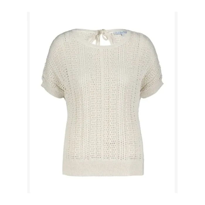 De Jerry Lurex Ajour is een top van een gebreide, zachte kwaliteit. De top heeft korte mouwen, een ronde hals en een striksluiting aan de achterkant. De Jerry Lurex Ajour heeft een geribde boord bij de hals, mouwen en aan de onderkant en heeft een glitter door het breisel. Verkrijgbaar in de kleuren pearl, desert, coppertan, raspberry, fresh blue & summersage.
