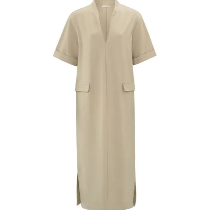 Deze stijlvolle midi-jurk is gemaakt van een comfortabele jersey stof en heeft een normale, elegante pasvorm. Het ontwerp is voorzien van een subtiele V-hals, korte mouwen met omgeslagen boorden en decoratieve klepzakken. De zijsplit voegt een speelse touch toe. Perfect voor een chique en moeiteloze look. Het model is 178 cm en draagt maat S.